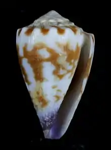 Apertural view of shell of Conus nux Broderip, 1833, measuring 21.3 mm in height, collected at low tide in San Carlos Bay, Mexico