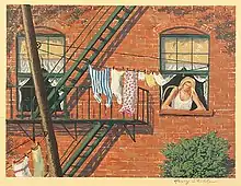 In the early 1930s a few American artists began experimenting with silk screen printing, a process then mostly used for posters, advertising, and similar applications.[38] In 1938 one of these artists, Anthony Velonis, convinced the Graphics Section of the WPA Art Project in New York City to set up a Silk Screen Unit.[39] With Velonis at its head, the artists in the unit were able for the first time to focus their energies on advancing silk screening as an artistic medium.[40] Called serigraphy or screen printing, the process quickly took hold in the New York art community.[41] In 1940 Edward Alden Jewell gave a concise description of the method. "A stopping out varnish is painted freely over a silk screen mesh," he wrote, "so that only the areas intended to receive color remain exposed. From three to thirty stencils may be prepared and properly registered with the total effect of an interesting gouache painting."[42] Harry Sternberg, one of the artists in the WPA group, later told an interviewer, "Posters and displays for store windows were screenprinted. It was a logical thing to do, to try to make [art] prints that way. We were all looking for a way to make inexpensive color prints. Prints were selling for $5 or $10 and we needed a cheap way to make them."[38]: 288 In an article published in 1964 Edward Landon, another member of the group, said the materials and equipment needed for serigraphy were affordable by virtually any artist. The method, he wrote, was easy to learn and any artist should be able to use it to create an edition of fine prints. At the same time it was so flexible that experienced serigraphers could make complex works of art.[43] Shokler was a member of the Silk Screen Unit. He later told an interviewer that in 1940, when the WPA project came to an end, he and about a dozen others rented a loft in a low-rent area of Manhattan's Lower East Side, where they perfected the technique and taught it to others.[32] The same year he also joined with former members of the unit to form an organization called the Silk Screen Group to promote and exhibit screen print works of art.[44] In 1944 the Silk Screen Group renamed itself the National Serigraph Society.[45] Shokler served as the society's president twice during its early years.[32] The group ceased to exist in 1962.[46]