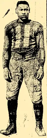 Ward teamed up with Halley Harding at Wilberforce University as a running back and placekicker. Called upon heavily during games, he was described in one account as a "consistent gainer" with "the speed of a Mercury."[1] In 1925, Ward experienced a breakout season, running for 98 yards in a single quarter against Linden Center in Dayton, Ohio and scoring 3 touchdowns against Lincoln University. He scored an additional 3 touchdowns against Kentucky State, gathering the attention of Pittsburgh Courier, who stated "Ward is never completely stopped. Aside from his running, Ward is a deadly tackler, a good punter, a good passer, and is first on the interference."[2] At the end of the season, Ward was named to the fullback position of the newspaper's very first All-American team.[3] In 1926 he missed time due to injuries from running a nail into his hand.,[4] but stayed true to form when he was on the field, scoring a 98 yard touchdown during a 16-0 win over Bluefield Institute.[2] He made national headlines again in late October when he intercepted a pass and scored an 80 yard touchdown in a 7-0 win over Lincoln University at Forbes Field in Pittsburgh.[5] Ward wrapped up his college football career on Thanksgiving Day in 1928, kicking a game-tying field goal in the closing moments of a 13-13 tie against West Virginia State in Cleveland, Ohio.[6]