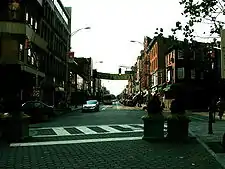 Harsimus (also known as Harsimus Cove) is a neighborhood within Downtown Jersey City, Hudson County, New Jersey, United States. The neighborhood stretches from the Harsimus Stem Embankment (the Sixth Street Embankment) on the north to Christopher Columbus Drive on the south between Coles Street and Grove Street[1] or more broadly, to Marin Boulevard. It borders the neighborhoods of Hamilton Park to the north, Van Vorst Park to the south, the Village to the west, and the Powerhouse Arts District to the east. Newark Avenue has traditionally been its main street.[2] The name is from the Lenape, used by the Hackensack Indians who inhabited the region and could be translated as Crow’s Marsh.[3] From many years, the neighborhood was part of the "Horseshoe", a political delineation created by its position between the converging rail lines and political gerrymandering.[4]