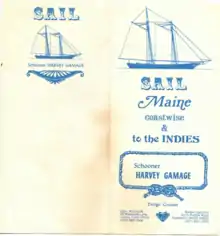 The Harvey Gamage is a 131' gaff rigged schooner launched in 1973[1] from the Harvey F. Gamage Shipyard in South Bristol, Maine. She was designed by McCurdy & Rhodes, Naval Architects in Cold Spring Harbor, New York and Frederick W. Bates of Damariscotta, Maine. She is a USCG inspected vessel both as a passenger vessel (subchapter T) and a sail training vessel (46 CFR 166 subchapter R-Nautical Schools).[2][3] As governments of maritime countries recognise Sail Training as an essential component of developing and maintaining an essential merchant marine force, the US Congress created a special service category of vessel for Sail Training and the Harvey Gamage is one of a handful of vessels licensed for this service. She has been educating students at sea along the east coast of North American almost continuously since her launch. She has 14 staterooms accommodating 39 people, including 9 professional crew, 22 youth sail trainees and up to 4 adult chaperones. As a training vessel, she takes crews of students along the eastern seaboard, from her home port in Maine to various destinations ranging from The Maritimes to the Caribbean[4]