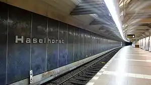 Haselhorst is a station on the Berlin U-Bahn line U7. It was opened on 1 October 1984 with the line's extension from Rohrdamm to Rathaus Spandau. Its name means "hazel eyrie" in English; it was named for the locality where it lies: Haselhorst in the borough of Spandau. It lies between the stations Zitadelle and Paulsternstraße. It was built by R.G.Rümmler, mentionable are interesting light effects on the ceiling. The next station is Paulsternstraße.[2]