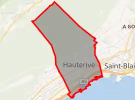 Hauterive has an area, as of 2009, of 2.1 square kilometers (0.81 sq mi). Of this area, 0.25 km2 (0.097 sq mi) or 11.8% is used for agricultural purposes, while 1.27 km2 (0.49 sq mi) or 59.9% is forested. Of the rest of the land, 0.64 km2 (0.25 sq mi) or 30.2% is settled (buildings or roads).[5]