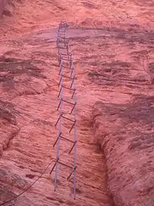 Mining interests also had a presence in the canyon in this period. Tunnels are a familiar sight in the campground area with the deepest of them around 300 feet (91 m). The largest of the mines is in Carbonate Canyon, adjacent to Havasu Falls, where rails and timbers still can be found descending three levels. Lead was mined here for the last time during WWII. Ranger Gale Burak, who worked at the Grand Canyon for several years, spoke of her experiences as a cook for the Havasu Lead and Zinc Company hard rock mining camp,[15] where the campground now resides. Below Mooney Falls, the famous pipe "ladder" ascended to a vanadium deposit.