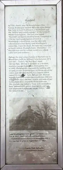 Lund Washington's brick house was destroyed by fire in 1917. Hayfield's second Round Barn outlasted successive changes in ownership until it too was lost in a fire on September 22, 1967. This information is on a plaque in Hayfield Park written by the Fairfax County Park Authority.