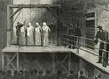 The next day (November 11, 1887) four defendants—Engel, Fischer, Parsons, and Spies—were taken to the gallows in white robes and hoods. They sang the Marseillaise, then the anthem of the international revolutionary movement. Family members including Lucy Parsons, who attempted to see them for the last time, were arrested and searched for bombs (none was found). According to witnesses, in the moments before the men were hanged, Spies shouted, "The time will come when our silence will be more powerful than the voices you strangle today."[85] In their last words, Engel and Fischer called out, "Hurrah for anarchism!" Parsons then requested to speak, but he was cut off when the signal was given to open the trap door. Witnesses reported that the condemned men did not die immediately when they dropped, but strangled to death slowly, a sight which left the spectators visibly shaken.[85]