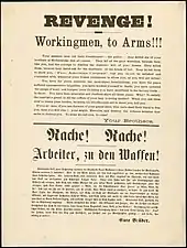 Outraged by this act of police violence, local anarchists quickly printed and distributed fliers calling for a rally the following day at Haymarket Square (also called the Haymarket), which was then a bustling commercial center near the corner of Randolph Street and Desplaines Street. Printed in German and English, the fliers stated that the police had murdered the strikers on behalf of business interests and urged workers to seek justice. The first batch of fliers contain the words Workingmen Arm Yourselves and Appear in Full Force! When Spies saw the line, he said he would not speak at the rally unless the words were removed from the flier. All but a few hundred of the fliers were destroyed, and new fliers were printed without the offending words.[32] More than 20,000 copies of the revised flier were distributed.[33]