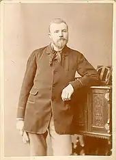 Rudolf Schnaubelt, the police's lead suspect as the bomb thrower, was arrested twice early on and released. By May 14, when it became apparent he had played a significant role in the event, he had fled the country.[63][67] William Seliger, who had turned state's evidence and testified for the prosecution, was not charged. On June 4, 1886, eight other suspects, however, were indicted by the grand jury and stood trial for being accessories to the murder of Degan.[68] Of these, only two had been present when the bomb exploded. Spies and Fielden had spoken at the peaceful rally and were stepping down from the speaker's wagon in compliance with police orders to disperse just before the bomb went off. Two others had been present at the beginning of the rally but had left and were at Zepf's Hall, an anarchist rendezvous, at the time of the explosion. They were: Arbeiter-Zeitung typesetter Adolph Fischer and the well-known activist Albert Parsons, who had spoken for an hour at the Haymarket rally before going to Zepf's. Parsons, who believed that the evidence against them all was weak, subsequently voluntarily turned himself in, in solidarity with the accused.[63] A third man, Spies's assistant editor Michael Schwab (who was the brother-in-law of Schnaubelt) was arrested as he had been speaking at another rally at the time of the bombing; he was also later pardoned. Not directly tied to the Haymarket rally, but arrested for their militant radicalism were George Engel (who was at home playing cards on that day), and Louis Lingg, the hot-headed bomb maker denounced by his associate, Seliger. Another defendant who had not been present that day was Oscar Neebe, an American-born citizen of German descent who was associated with the Arbeiter-Zeitung and had attempted to revive it in the aftermath of the Haymarket riot.[69]