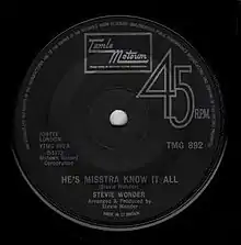 "He's Misstra Know-It-All" is a single by Stevie Wonder for the Tamla (Motown) label, from his Innervisions album, which reached number 10 on the UK Singles Chart in May 1974.[2] The song takes the form of a mellow ballad with a steady beat, principally a solo performance with Wonder providing lead vocal, background vocal, piano, drums, handclaps and congas. Ethereal flute-like sounds are provided by his TONTO modular synthesiser. Willie Weeks, on electric bass, is the only other musician. Towards the end of the song the mood changes to a stronger feel, more strident singing and with hand-claps emphasising the beat, half-beat and quarter-beat.