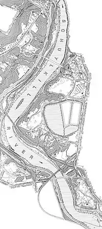 The Columbia Railroad Bridge, is the most difficult part of the course because coxswains must make a sharp turn of nearly ninety degrees.[13]