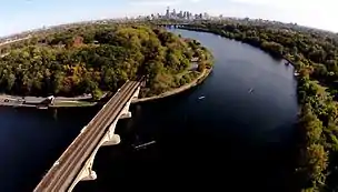 There is a dangerous waterfall less than 300 meters from the finish line across from Boathouse Row.[14] The 13-foot Fairmount Water Works Dam stretches 400 meters across the Schuylkill.[14]