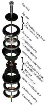 Bicycle headset bearings are usually ball bearings, either loose balls, caged balls, or presealed in a cartridge; needle bearings are also available.[9]