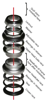 Threaded headsets are used with forks that have a threaded steerer tube and are the traditional type (as shown in the above picture). There are eight parts in a threaded headset (from bottom to top): crown race, lower bearings, lower frame cup (pictured as "lower head-tube race"), upper frame cup (pictured as "upper head-tube race"), upper bearings, upper race or cone, washer, locknut.