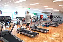 A cardio theater or cardio area includes many types of cardiovascular training-related equipment such as rowing machines, stationary exercise bikes, elliptical trainers and treadmills. These areas often include a number of audio-visual displays, often TVs (either integrated into the equipment or placed on walls around the area itself) in order to keep exercisers entertained during long cardio workout sessions. Some gyms provide newspapers and magazines for users of the cardio theatre to read while working out.