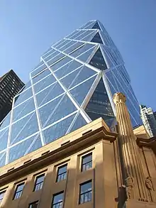 Critics also highlighted the newer tower's contrast with the older base. A writer for Newsday stated that the tower demonstrated "the effect of one era's modern architecture giving birth to another's", saying that Foster's tower "seems to float above and behind the original shell."[25] The Financial Times wrote, "There is no attempt to harmonise or grow organically from Urban's oddity [...] On the other hand the old building has not been ignored—quite the opposite."[128] Nicolai Ouroussoff of The New York Times said, "Past and present don't fit seamlessly together here; they collide with ferocious energy", characterizing the Hearst Tower's design as "deeply comforting".[129] Architectural writer Paul Goldberger, in The New Yorker, praised the Hearst Tower as the "most beautiful skyscraper to go up in New York" since 140 Broadway was completed in 1967.[117] Not all critics were positive: Robert Campbell wrote in Architectural Record that the tower was designed "as if the Pentagon, with its usual deftness of touch, had confused its maps and located this chunk of military hardware in Manhattan instead of Florida."[130] Muschamp, of the Times, said the new building resembled a "glass square peg in a solid square hole".[39][44]