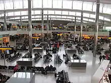 The main terminal building (Concourse A) has an area of 300,000 square metres (3,200,000 sq ft) while Concourse B covers 60,000 square metres (650,000 sq ft).[62] It has 60 aircraft stands and capacity for 30 million passengers annually as well as more than 100 shops and restaurants.[63] It is also home to British Airways' Flagship lounge, the Concorde Room, alongside four further British Airways branded lounges.[64] One of those lounges is the British Airways Arrivals Lounge which is located land-side.