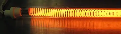 - Radiative heating elements (heat lamps): A high-powered incandescent lamp usually run at less than maximum power to radiate mostly infrared instead of visible light. These are usually found in radiant space heaters and food warmers, taking either a long, tubular form or an R40 reflector-lamp form. The reflector lamp style is often tinted red to minimize the visible light produced; the tubular form comes in different formats: