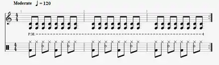 The rhythm in metal songs is emphatic, with deliberate stresses. Weinstein observes that the wide array of sonic effects available to metal drummers enables the "rhythmic pattern to take on a complexity within its elemental drive and insistency".[21] In many heavy metal songs, the main groove is characterized by short, two-note or three-note rhythmic figures—generally made up of 8th or 16th notes. These rhythmic figures are usually performed with a staccato attack created by using a palm-muted technique on the rhythm guitar.[36]