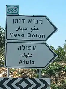The Hebraization of place-names was encouraged by the Israeli government, aiming to strengthen the connection of Jews, most of whom had immigrated in recent decades, with the land.[13] As part of this process, many ancient Biblical or Talmudic place-names were restored.[14] In some cases, even sites with only Arabic names and no pre-existing ancient Hebrew names or associations have been given new Hebrew names.[15][14] However, in some instances, the Palestinian Arabic place name was preserved in the modern Hebrew, despite there being a different Hebrew tradition regarding the name, as in the case of Banias, and where, in classical Hebrew writings, the place is called Paneas.[16] Municipal direction sign-posts and maps produced by state-run agencies sometimes note the traditional Hebrew name and the traditional Arabic name alongside each other, such as "Nablus / Shechem" and "Silwan / Shiloach", inter alia.[17] In certain areas of Israel, particularly mixed Jewish–Arab cities, there is a growing trend to restore the original Arabic street names which were Hebraized after 1948.[18][19]