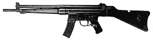 The origin of the G3 can be traced back to the final years of World War II when Mauser engineers at the Light Weapon Development Group (Abteilung 37) at Oberndorf am Neckar designed the Maschinenkarabiner Gerät 06 (MKb Gerät 06, "machine carbine device 06") prototype assault rifle chambered for the intermediate 7.92×33mm Kurz cartridge, first with the Gerät 06 model using a roller-locked short recoil mechanism originally adapted from the MG 42 machine gun but with a fixed barrel and conventional gas-actuated piston rod.[3] With careful attention to the mechanical ratios, the gas system could be omitted.[4] The resultant weapon, Gerät 06H (the "H" suffix is an abbreviation for halbverriegelt - "half-locked") was assigned the designation StG 45(M) (Sturmgewehr 45(M) , assault rifle 45) but was not produced in significant numbers and the war ended before the first production rifles were completed.[5]
