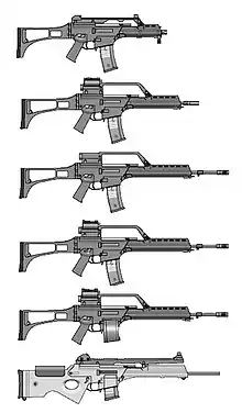 G36 variants from top to bottom: G36C, G36K, G36V (G36E), G36, MG36 and SL8