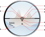 The standard German Army versions of the G36 are equipped with a ZF 3×4° dual optical sight that combines a 3× magnified telescopic sight (with the main reticle designed for firing at 200 m and bullet drop compensation markings for: 200, 400, 600 and 800 m crosshairs and a range-finding scale) and an unmagnified reflex sight (calibrated for firing at 100 m) mounted on top of the telescopic sight.[3] The reflex sight is illuminated by ambient light during the day and uses battery powered illumination for use at night. Electric illumination is activated automatically by a built in photo sensor and can be manually activated to boost the brightness of the reticle in daytime low contrast situations.[16]