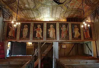 The interior is tiny (35 square meters) and very plain, and when originally built, the church had only walls and a roof, earth floor and no windows. It has been modified and added to a couple of times, gaining wooden floor in 1735 and the present windows in 1781. Before that it only had a small light hole (lysglugg). In 1901 its exterior was restored to be as original as possible, but the windows were kept. In 1934-35 the interior was restored, and when removing the inner walls an altar painting was discovered. It was painted directly on the wall. A more advanced restoration took place in the 1990s. The church was raised some 70 centimetres, and the old wooden ground was replaced.