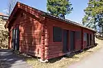 Körlogen (köra=drive;loge=a type of barn) is a former barn with doors large enough to let a horse cart in and out. The building was erect at Hedemora gammelgård in 1992-1994 and comes, like the härbre, from Skommargården in Ivarshyttan. | 60°17′4.8″N 15°58′39.5″E | Körlogen, Hedemora gammelgård |