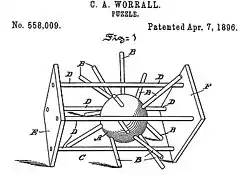 Although known mainly through the children's stories written by the Czech Jaroslav Foglar in the 1940s, the Hedgehog in the Cage has its origins in the United States. The first known similar puzzles were made since 1886 by the Trilby company in Brooklyn.[1] The puzzle was patented by the American inventor Clarence A. Worrall in Philadelphia, Pennsylvania, on 7 April, 1896.[2][3] It has been suggested that Worrall's invention was inspired by a Japanese puzzle called the Snake and Star, which appeared in the catalogue of the games manufacturer Selchow & Righter on 25 May, 1895.[2] The principle of both inventions is similar: solving the puzzle involves finding the correct position and angle that allows the object ("the hedgehog" or "the star") to be removed from its entrapment in the cage or the snake.