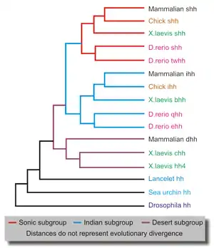 Lancelets, which are primitive chordates, possess only one homologue of Drosophila Hh (figure 7). Vertebrates, on the other hand, have several Hedgehog ligands that fall within three subgroups – Desert, Indian and Sonic, each represented by a single mammalian gene. This is a consequence of the two rounds of whole genome duplication that occurred early in the vertebrate evolutionary history.[62] Two such events would have produced four homologous genes, one of which must have been lost. Desert Hedgehogs are the most closely related to Drosophila Hh. Additional gene duplications occurred within some species[15] such as the zebrafish Danio rerio, which has an additional tiggywinkle hedgehog gene in the sonic group. Various vertebrate lineages have adapted hedgehogs to unique developmental processes. For example, a homologue of the X.laevis banded hedgehog is involved in regeneration of the salamander limb.[63]