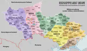 Hegewald was a short-lived German colony during World War II, situated near Zhytomyr in Reichskommissariat Ukraine. It was repopulated in late 1942 and early 1943 by ethnically German settlers classified as Volksdeutsche transferred from occupied territories of Poland, Croatia, Bessarabia, and the Soviet Union to an area earmarked for the projected Germanization of the Ukrainian lands. The plans were prepared months in advance by the SS, RKFDV and VoMi, but major problems with supplies occurred right from the region's initial establishment.[1] Heinrich Himmler's original plans to recruit settlers from Scandinavia and the Netherlands were unsuccessful.[2]