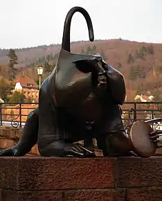 The Heidelberg Bridge Monkey dates back to the 15th century. It was a stone statue sitting in the tower of the Old Bridge, which was located opposite Heidelberg’s Old Town. The purpose of the tower was to instill fear and respect in anyone arriving in the town, while the monkey represented mockery. The statue was destroyed with the tower during the Nine Years' War.[1]