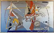 The station building of the new station was designed by Deutsche Bundesbahn director Helmuth Conradi (1903–1973), who in the 1920s had studied architecture under Paul Schmitthenner and Paul Bonatz of the Stuttgart School of architecture[25] (particularly associated with Stuttgart Hauptbahnhof). The ticket hall was built with glazed longitudinal walls at an angle of 50 degrees to the tracks, as designed by Hans Freese during the Nazi period. On the south wall, which is of 53 metres long, 16 metres wide and 12 metres high,[4] there is a sgraffito by Karl Joseph Huber on the theme of motion ("Helios with the Sun Chariot", Helios mit dem Sonnenwagen).[26] A second section of the building was laid parallel to the tracks with rooms for the reception of luggage and express freight, waiting rooms and the station restaurant on the ground floor and offices for the railway administration on the upper floors. Located in the angle between two sections of the building there is a spiral staircase connecting to both sections.[27] Extending from the station building to the platforms is a 91 metre long and 20 metre wide hall. The roof of the hall was built with curved surfaces made of prestressed concrete and filled with glass.