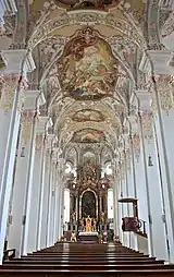 Among several items of art-historical interest in the church are: in the portico, to left and right of the main entrance, parts of a bronze memorial made in 1608 by Hans Krumpper for Duke Ferdinand of Bavaria, Infante of Spain; in the chancel, the high altar by Nikolaus Stuber (1730), with an altarpiece by Ulrich Loth depicting The Effusion of the Holy Ghost (1661) and two flanking figures of angels by Johann Georg Greiff (1729); in the right aisle, a series of wall paintings (1725) by Peter Jacob Horemans illustrating the Seven Gifts of the Holy Spirit; in the Kreuzkapelle, a late Gothic crucifix (1510); and, midway along the left aisle, an altar with an allegedly miraculous image of the Hammerthaler Madonna (15th century).