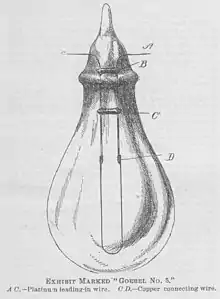Two patents were granted to Heinrich Göbel in 1882, an improvement of the Geissler system of vacuum pumps and a solution to connect carbon-filaments and metal-wires in a light bulb.[9][10]