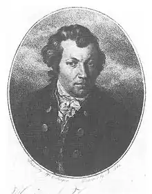 Johann Heinrich Zimmermann was born on 25 December 1741 in Wiesloch, a short distance south of Heidelberg in the Palatinate.[1] Leaving home in 1770, Zimmermann had a variety of jobs around Europe. He had trained as a ‘Gürtler’, the profession of a worker in precious and non-precious metals who made ornaments, jewelry, cutlery including swords, metal tools and implements. He spent time working at this in Geneva, Lyons and Paris before he arrived in London in 1776 where, after a short period of working in a sugar refinery, he joined HMS Discovery as an able seaman on 12 March of that year for James Cook's third voyage to the Pacific.[2] He became the ship's coxswain in July 1776. During the voyage he kept a concise journal (contrary to orders) written in abbreviated German in a small notebook, which he afterwards used to write an account of it, Reise um die Welt mit Capitain Cook, published in Mannheim in 1781 and in Munich in 1783.[3] He had the help of a friend in writing it, according to Johann Reinhold Forster.[4] A French edition was published in Berne in 1782, and a Dutch edition in 1784.[5] A Russian translation of Zimmermann's account of Cook's last voyage was published in St. Petersburg in 1786 and 1788.[6] The fame generated by the book led to Zimmermann being appointed in August 1781 by the Prince Elector of Bavaria, Karl Theodor, to the position of “Churfürstlicher Leibschiffmeister” (Master of the Prince Elector's Ships), where he was responsible for the fleet of hunting and excursion boats on Lake Starnberg.[7]