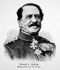 During the Austro-Prussian War Heinrich von Zastrow commanded 11th Division part of Second Army. He participated in Battle of Königgrätz. During the battle, his division captured Nedeliste.[2] On 16 September 1866, Zastrow was awarded the Pour le Mérite.[3] When the Franco-German War erupted in 1870 Zastrow was given command of VII Corps (part of Steinmetz's First Army), with which he distinguished himself at Spicheren, Gravelotte and the siege of Metz. After the fall of Metz Zastrow besieged Thionville, Montmédy and Mézières. In the last phase of the war VII Corps was part of Manteuffel's Army of the South. After the end of the war he was given a dotation of 100.000 thaler in recognition of his service. He retired from the army in 1872.[1]