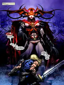 Hela then summoned the Valkyrie to aid in a war against Ollerus, while Hela encountered the other Defenders.[15] Hela was then forced to join a conspiracy of Loki and Tyr against Odin.[16] She also unwillingly entered an alliance with the death-gods of other Earth pantheons, joining their realms together to create a vast hell. As a result, she was destroyed and devoured along with other Death-gods by Demogorge the God-Eater, though it happened to her last, who was wakened by the joining, but was restored to life with Demogorge's defeat.[17]