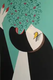 Helen Zughaib (/zəˈɡeɪb/ zə-GAYB;[1] born 1959) is a painter and multimedia artist living in working in Washington, D.C. She was the daughter of a State Department civil servant. Her family left Lebanon in 1975 due to the outbreak Lebanese Civil War, and moved to Europe as a teenager, attending high school in Paris. She studied at Northeast London Polytechnic School of Art.[2] She moved to the United States to study visual and performing arts at Syracuse University graduating in 1981 with her BFA.[2] She first learned about gouache paints at SU and continues to use gouache as her primary medium, but also creates mixed media installations.[3] Her themes are centered around hopefulness, healing, and spirituality, using visual arts to shape and foster positive ideas about the Middle East.[2] She has served as cultural envoy to Palestine, Switzerland, and Saudi Arabia.[4] She has also been selected for the 2021-2023 inaugural social practice residency by the John Kennedy Center in Washington D.C.[4]