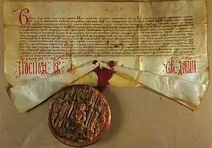 Whatever Queen Helen's official role was meant to be, she functioned as a mere puppet of the nobility. All her surviving charters specifically note that they had been approved by the major noblemen.[6] In a surviving charter, Queen Helen names "Duke Hrvoje Vukčić Hrvatinić, Prince Pavle Radenović, Duke Sandalj Hranić, and Tepčija Batalo" as the magnates whom she consulted.[7] The emancipation of Bosnian nobility reached a peak during Helen's reign. Having become virtually autonomous, her vassals engaged in internal warfare which weakened the Kingdom and precluded its participation in regional politics.[2][8]
