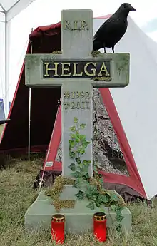A person may call for a Helga,[1] others answer and come to a chorus like group effect.[2] „Helga ist tot!“ (Helga is dead) denies the helgaing request.[3] Further allegations are gravestones, memorials or graffiti. The background is unknown, some reports point to a rather rainy Hurricane Festival in Scheeßel, where a high pressure cyclone called Helga was called for but didn't arrive in time. The call was namegiver for an annual prize for German festivals.[4] and is being used by a service company.[5]