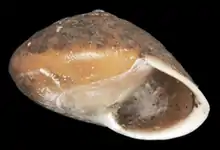 | An apertural view of the shell of Helicina guppyi. Note the presence of the operculum. The height of the shell is 5.99 mm. | |