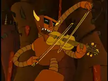 The Robot Devil tells them that the only way to win back Bender's soul is to beat him in a fiddle-playing contest, as required under the "Fairness in Hell Act of 2275". The Robot Devil goes first, playing Antonio Bazzini's "La Ronde des Lutins". Leela responds, having experience in playing the drums, but after a few notes it is clear Leela's fiddle-playing is pathetic, so she assaults the Robot Devil with the fiddle instead. As Fry, Leela, and Bender flee the Robot Devil's clutches, Bender steals the wings off a flying torture robot, attaches them to his back, and airlifts Fry and Leela to safety. Leela drops the heavy golden fiddle onto the Robot Devil's head, making them light enough to escape. Bender promises to never be too good or too evil, but to remain as he was before joining the Temple of Robotology. Over the closing credits, a remix of the show's theme song plays instead of the original version.