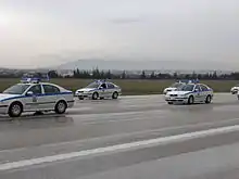 The most common police vehicles in Greece are the white with blue stripes Citroën Xsara, Škoda Octavia, Mitsubishi Lancer Evolution X, Hyundai i30, Citroën C4, Citroën C4 Picasso, Suzuki SX4, Jeep Liberty, Peugeot 308, Volkswagen Golf, and Nissan Qashqai. Other vehicles that Greek Police has used throughout the years are the following: