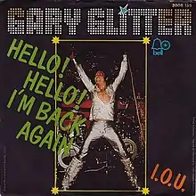 "Hello, Hello, I'm Back Again" is a song by English glam rock singer Gary Glitter, written by Glitter with Mike Leander and produced by Mike Leander. The title of the song is only sung twice and as a result other more frequent sung lines have become alternative titles, these include "It's Good to Be Back" and "Did You Miss Me?". Sometimes the title is shortened to simply "Hello, Hello".