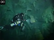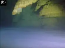 Hells Bells are in the El Zapote sinkhole (cenote), a 54-metre-deep (177 ft) water-filled bottle-[1] or hourglass-shaped cavern.[12] At the bottom of the cavern lies a debris mound; strong rain can sweep material into the sinkhole, including some submerged tree trunks that are up to 8 metres (26 ft) long[1] and leaves and other plant remains that cover the floor of the sinkhole.[13] A shaft rises to the surface to the actual sinkhole and is about 8.7 by 10.8 metres (29 ft × 35 ft) wide there, while the submerged cavern reaches a width of over 100 metres (330 ft);[1] there is no detectable flow of water in the deeper cavern.[13] Sinkholes such as El Zapote are common in the wider region and form through the collapse of caves.[14]