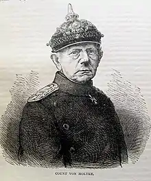 Helmuth Karl Bernhard Graf[1] von Moltke (German: [ˈhɛlmuːt fɔn ˈmɔltkə]; 26 October 1800  24 April 1891) was a Prussian field marshal. The chief of staff of the Prussian Army for thirty years, he is regarded as the creator of a new, more modern method of directing armies in the field. He commanded troops in Europe and the Middle East, commanding during the Second Schleswig War, Austro-Prussian War and the Franco-Prussian War. He is described as embodying "Prussian military organization and tactical genius."[2] He was fascinated with railways and pioneered their military usage.[3] He is often referred to as Moltke the Elder to distinguish him from his nephew Helmuth von Moltke the Younger (Helmuth Johann Ludwig von Moltke), who commanded the German Army at the outbreak of World War I.