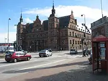 Formerly located on a sea bed, this station building rests on 1,600 poles embedded into the ground. It was designed by architect Niels Peder Christian Holsøe in collaboration with Heinrich Wenck in a Neo-Renaissance style locally known as Rosenborg Style after Rosenborg Castle in Copenhagen. It imitates Christian IV's Dutch Renaissance-style buildings from the first half of the 17th century and is characterized by red brickwork combined with sandstone ornamentation Dutch gables and an abundance of turrets with copper-clad spires.