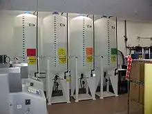 The dialysate solution is then softened. Next the water is run through a tank containing activated charcoal to adsorb organic contaminants. Primary purification is then done by forcing water through a membrane with very tiny pores, a so-called reverse osmosis membrane. This lets the water pass, but holds back even very small solutes such as electrolytes. Final removal of leftover electrolytes is done by passing the water through a tank with ion-exchange resins, which remove any leftover anions or cations and replace them with hydroxyl and hydrogen ions, respectively, leaving ultrapure water.