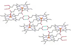 β-Hematin crystals are made of dimers of hematin molecules that are, in turn, joined together by hydrogen bonds to form larger structures. In these dimers, an iron-oxygen coordinate bond links the central iron of one hematin to the oxygen of the carboxylate side-chain of the adjacent hematin. These reciprocal iron–oxygen bonds are highly unusual and have not been observed in any other porphyrin dimer. β-Hematin can be either a cyclic dimer or a linear polymer,[31] a polymeric form has never been found in hemozoin, disproving the widely held idea that hemozoin is produced by the enzyme heme-polymerase.[32]